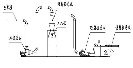鎂屑機(鎂錠切割機、鎂錠屑割機、鎂錠完屑機、鎂屑斷屑機、鎂屑碎屑機)是完成切削鎂錠的主要設備;液壓站為鎂屑機壓料、進給提供動力;配電柜及配套電器承擔刀輥旋轉、油泵開停、液壓閥換向等各種設定功能的自動控制工作。斷屑機對鎂屑機切出的鎂屑進行粗粉碎。落料器收集粗粉碎后的鎂屑;風機為鎂屑在系統(tǒng)內的運動提供動力。